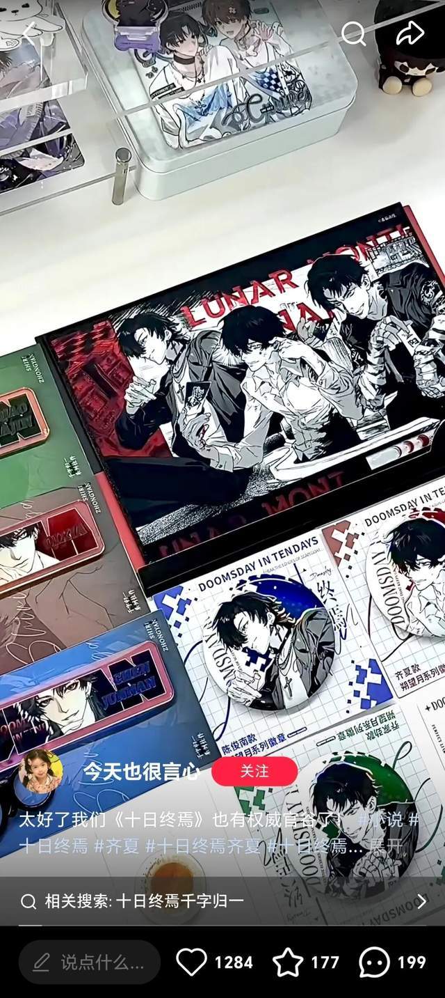 “《十日终焉》官周不多,过去几乎只有伴随实体书购买的赠品。去年开始陆续有一些专门的官方衍生,今年多了起来,也有线下快闪店,开始推出各个主题了。”小夏告诉剁椒。为了表示支持,今年6月,她一口气端了十盒《沉沦伊甸园》系列盲盒徽章套组。截至目前,她在官周衍生品上的消费次数已经超过10次。